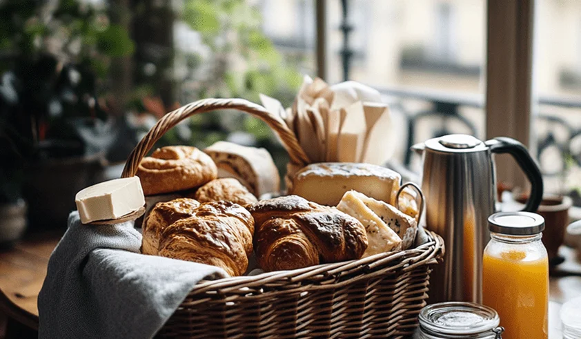 Chez Joli Môme, chaque matin commence par un voyage à travers les saveurs du quartier. Le petit-déjeuner, servi sur la grande table d’hôtes, met à l’honneur les produits locaux, soigneusement sélectionnés auprès des artisans et commerçants du quartier. Ici, tout raconte une histoire : les croissants dorés et les pains au chocolat viennent des meilleures boulangeries du coin, les confitures artisanales reflètent le savoir-faire des producteurs locaux, et les fromages affinés célèbrent la richesse des terroirs français.